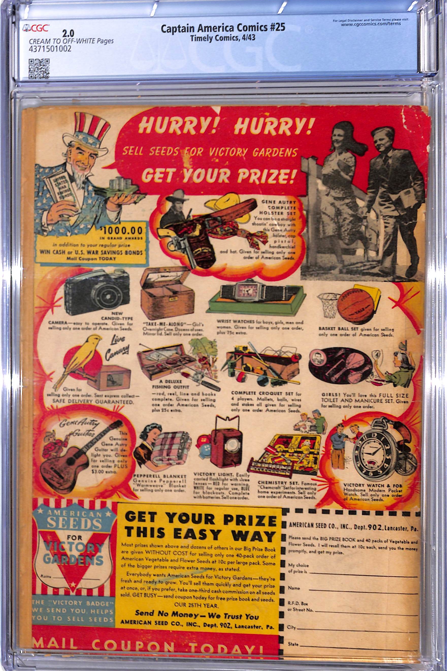 Captain America Comics # 25 CGC 2.0