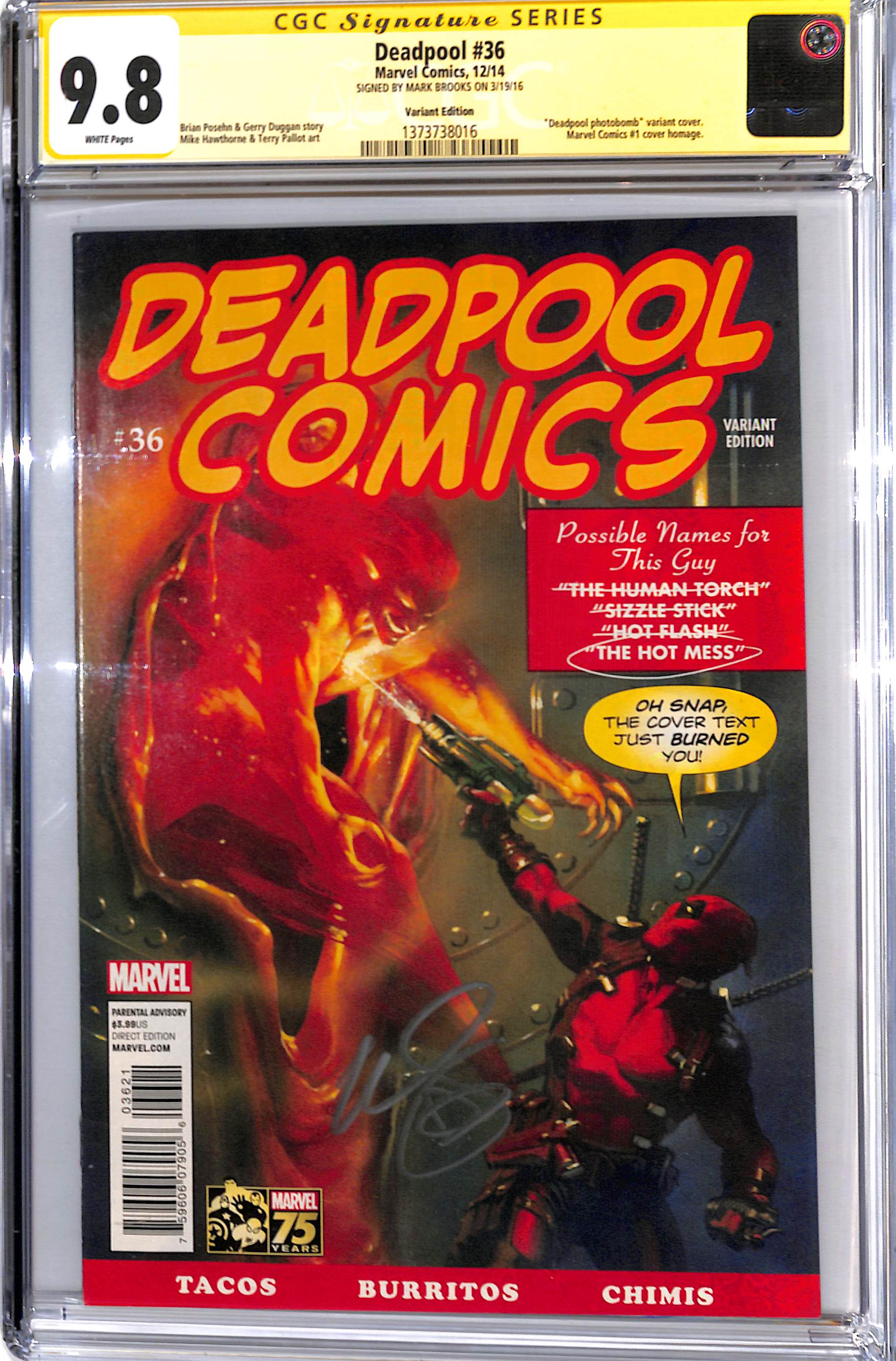 - SIGNED BY MARK BROOKS ON 3/19/16 Art Comments Brian Posehn & Gerry Duggan story Mike Hawthorne & Terry Pallot art Gabriele Dell'Otto cover Key Comments "Deadpool photobomb" variant cover. Marvel Comics #1 cover homage.