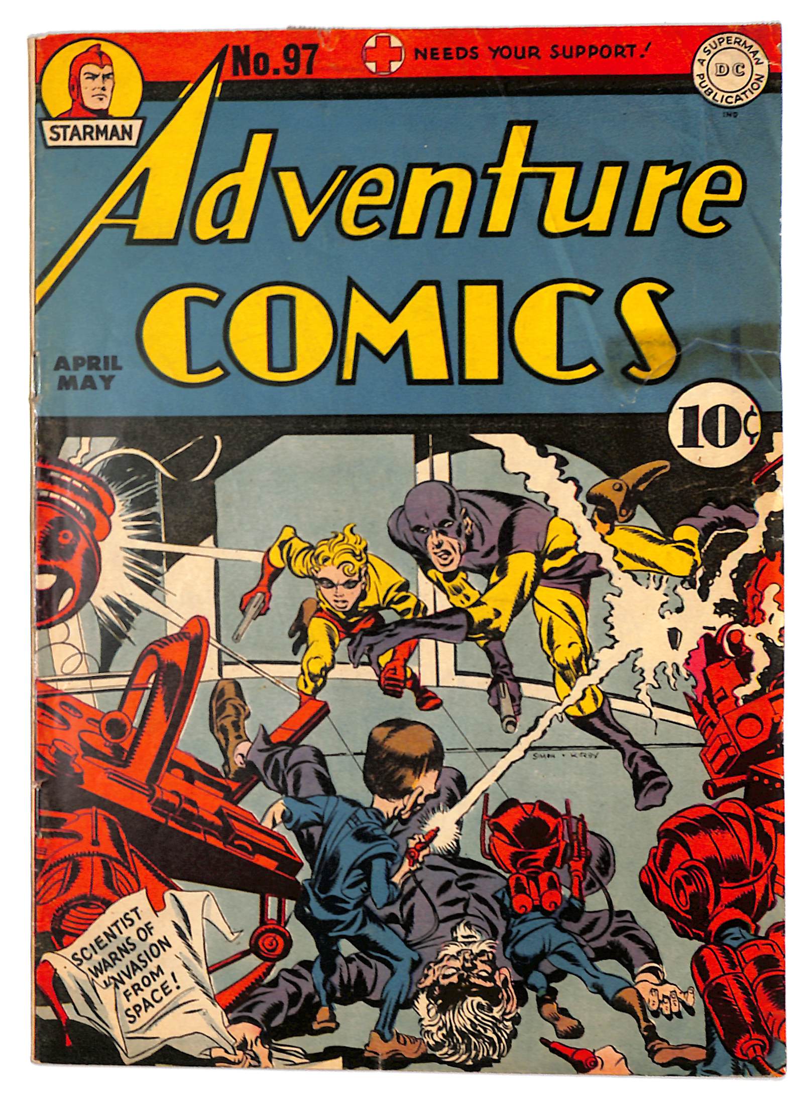 - Tape on inside cover. Cover pencils by Jack Kirby, inks by Joe Simon. No Curtains For Cupid, script by Joe Samachson, art by Pen Shumaker; The Eraser Kid is not one to allow a former crook like Harry Long go straight, so he devises a plot to force Harry back into the rackets; What Eraser doesn't count on are Harry's allies: the Sandman and Sandy! Barbs of Chivalry starring the Shining Knight, art by Louis Cazeneuve. The Clue That Wasn't There starring Genius Jones, art by Stan Kaye. Stolen Glory starring Starman, script by Joe Samachson, art by Emil Gershwin. The Life of Riley starring Mike Gibbs, Guerilla, script by Joe Samachson, art by Maurice Del Bourgo.