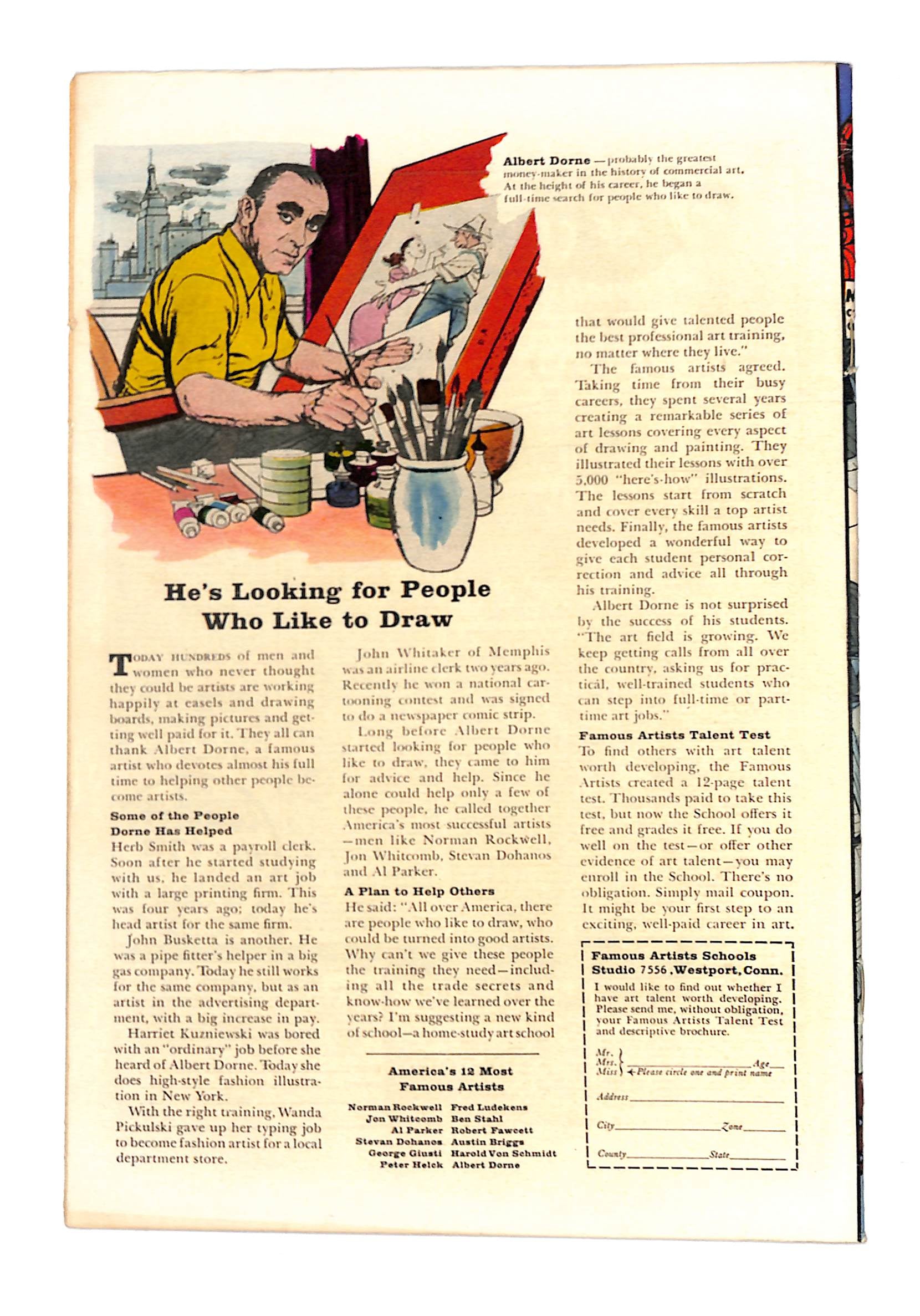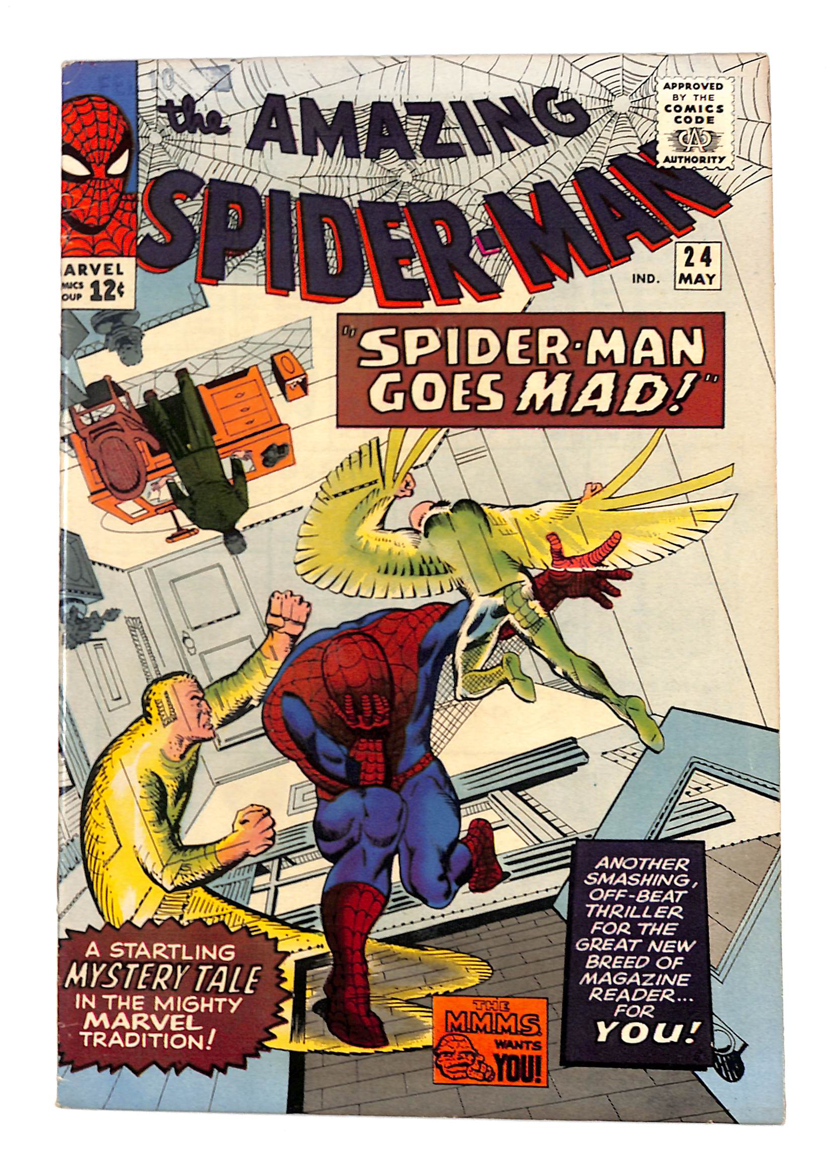 - Spider-Man goes to see a psychiatrist! But it's really Mysterio messing with Spidey's mind in "Spider-Man Goes Mad." Script by Stan Lee, art and cover by Steve Ditko. Cameos (actually part of Spider-Man's imagination) by Doctor Octopus, the Vulture, and the Sandman. Reprinted in Marvel Tales # 19 and 162. Letters to the editor from comics writer Don McGregor and mycomicshop.com president Buddy Saunders!