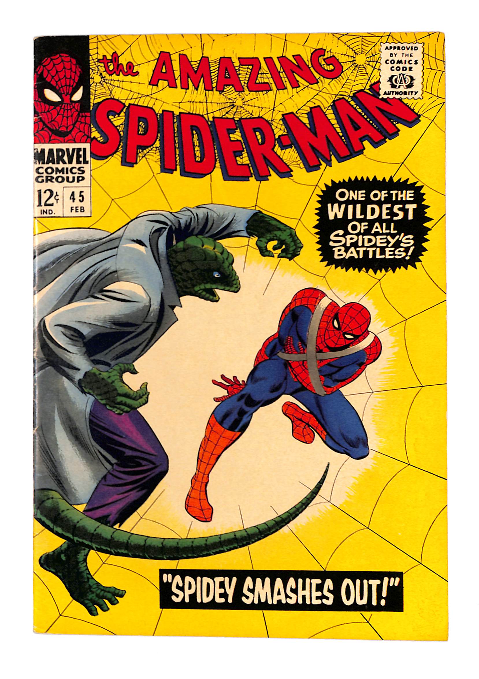 • Chip out of back cover. Cover by John Romita Sr.. The third appearance of the Lizard in Spidey Smashes Out!, script by Stan Lee, art by John Romita Sr.; The Lizard heads to Dr. Connor's lab to find a formula to transform reptiles into his personal army; Aunt May worries about Peter; The Lizard and Spider-Man battle aboard a train. Reprinted in Marvel Tales # 185.