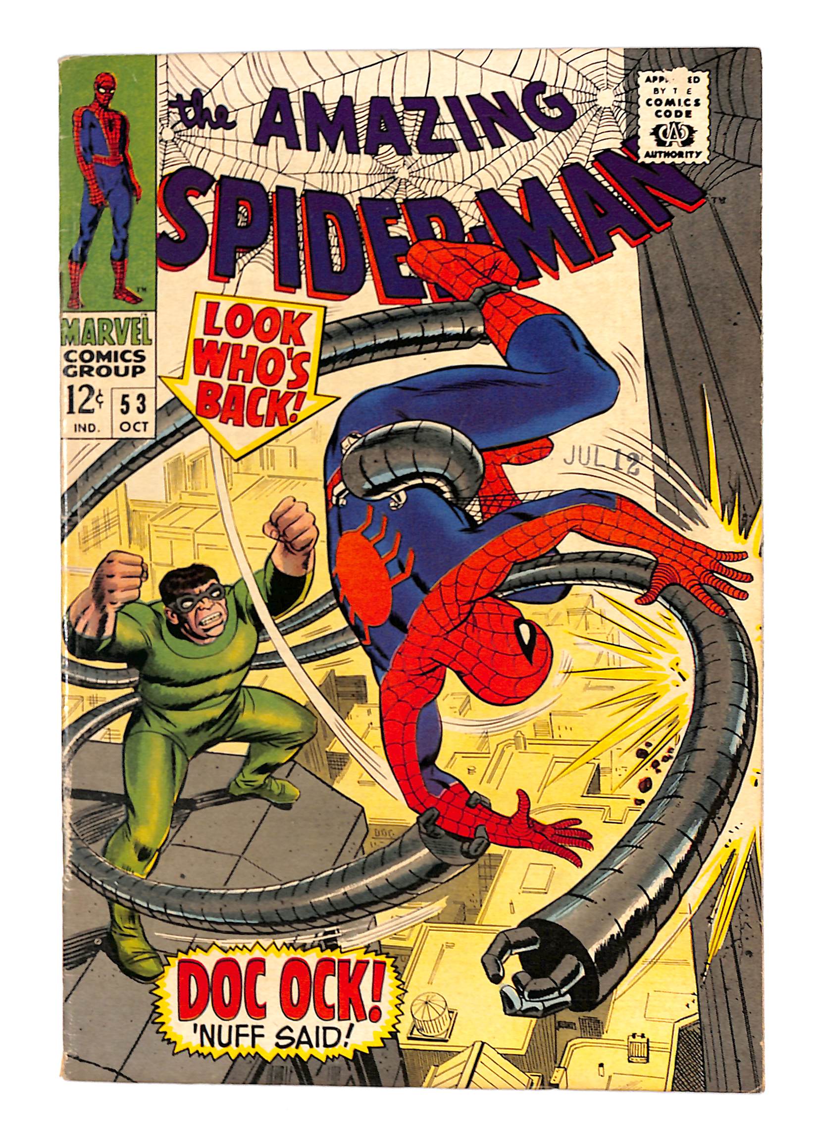 - Doctor Octopus. Story synopsis: Peter and Gwen are off to the Science Expo with Professor Warren to see the "nullifier," but unfortunately Dr. Octopus is there too. Only he isn't there to listen to the lecture, he's there to steal it! After putting up a good fight, Spider-Man finally gets the nullifier back, but not before slipping a spider tracer on Doc Ock. Doc Ock finds the tracer when he gets back to his lab and decides to set up a trap for Spidey, but come on, Spidey isn't gonna fall for it. Aunt May and Anna Watson put an ad in the paper looking for a boarder at their house. And guess who answers the ad? That's right, the one and only Otto Octavius. "Enter Dr. Octopus." Script by Stan Lee, pencils by John Romita Sr., inks by Mike Esposito as "Mickey Demeo." Romita cover. Reprinted in Marvel Tales # 38.