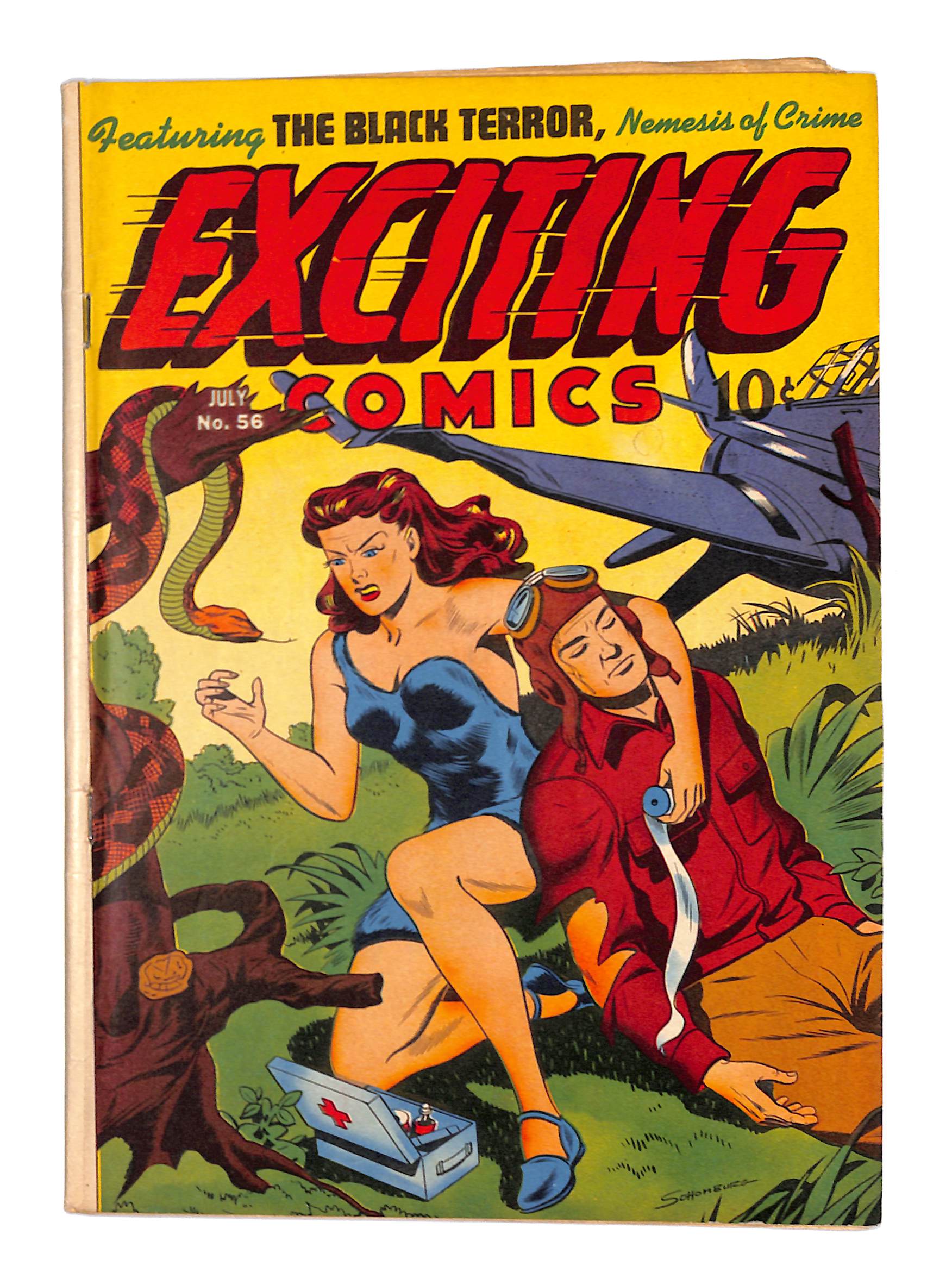 - Cover by Alex Schomburg. Stories by Al Hartley and unknown. Art by Al Hartley, Ralph Mayo, Edmond Good, Graham Ingels, Mort Meskin and unknown. In this issue: "Exciting Headliners" table of contents page with art by Graham Ingels; The Black Terror in "The Mastermind of the Moon"; Roger Dodger in "Nice Mice" by Al Hartley; Judy of the Jungle in "The Lords of Memnon" with art by Ralph Mayo (story continues in #58); Strut Simmons in "Death Cargo" with art by Edmond Good; and The Crime Crushers in "The Case of the Reckless Necklace" with most of the art by Mort Meskin (and some of the inks possibly by Frank Frazetta). Plus: 1-page text story "Rock Collector" (by Charles S. Strong; credited as Charles Stoddard); untitled You Just Can't Win! 1-pager (by Jules Steiner); 2-page text story "Rhythm of the Jungle" (by Donald Bayne Hobart); and untitled Little Legends 1-pager (by Jules Steiner).