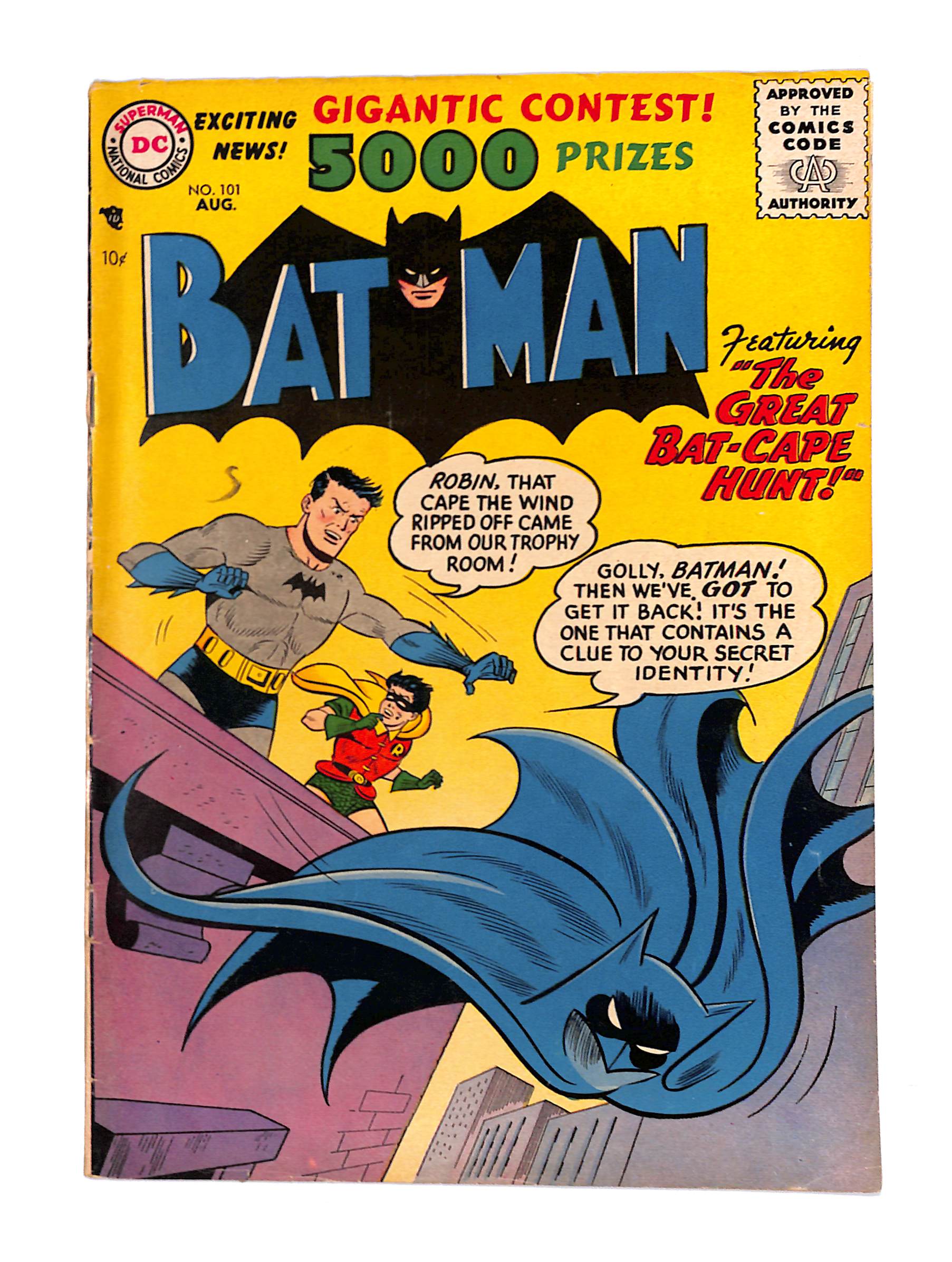 - Cover by Sheldon Moldoff. "The Vanished Batman," script by Edmond Hamilton, pencils by Sheldon Moldoff (as Bob Kane), inks by Stan Kaye; Gotham City is shocked to see Robin drive up to Police HQ one day in a Robinmobile, but he refuses to comment on the disappearance of his long-time partner in crime-fighting. The Case of the Careless Camper! public service announcement with Peter Porkchops. "The Six Strangest Sleuths," script by Edmond Hamilton, pencils by Sheldon Moldoff, inks by Charles Paris; When crooks rob the box office at a Vaudeville performers performance, Batman enlists the aid of six former vaudevillians to help track them down. One-page Casey the Cop story by Henry Boltinoff. Two-Wheeled Lawmen article by Jack Miller. Half-page Little Orvil story. "The Great Bat-Cape Hunt!", script by Bill Finger, pencils by Sheldon Moldoff, inks by Charles Paris; Batman loses his cape and cowl on a windy day in Gotham City, but, realizing it has his secret identity sewn into it, he makes every effort to retrieve it before crooks do.